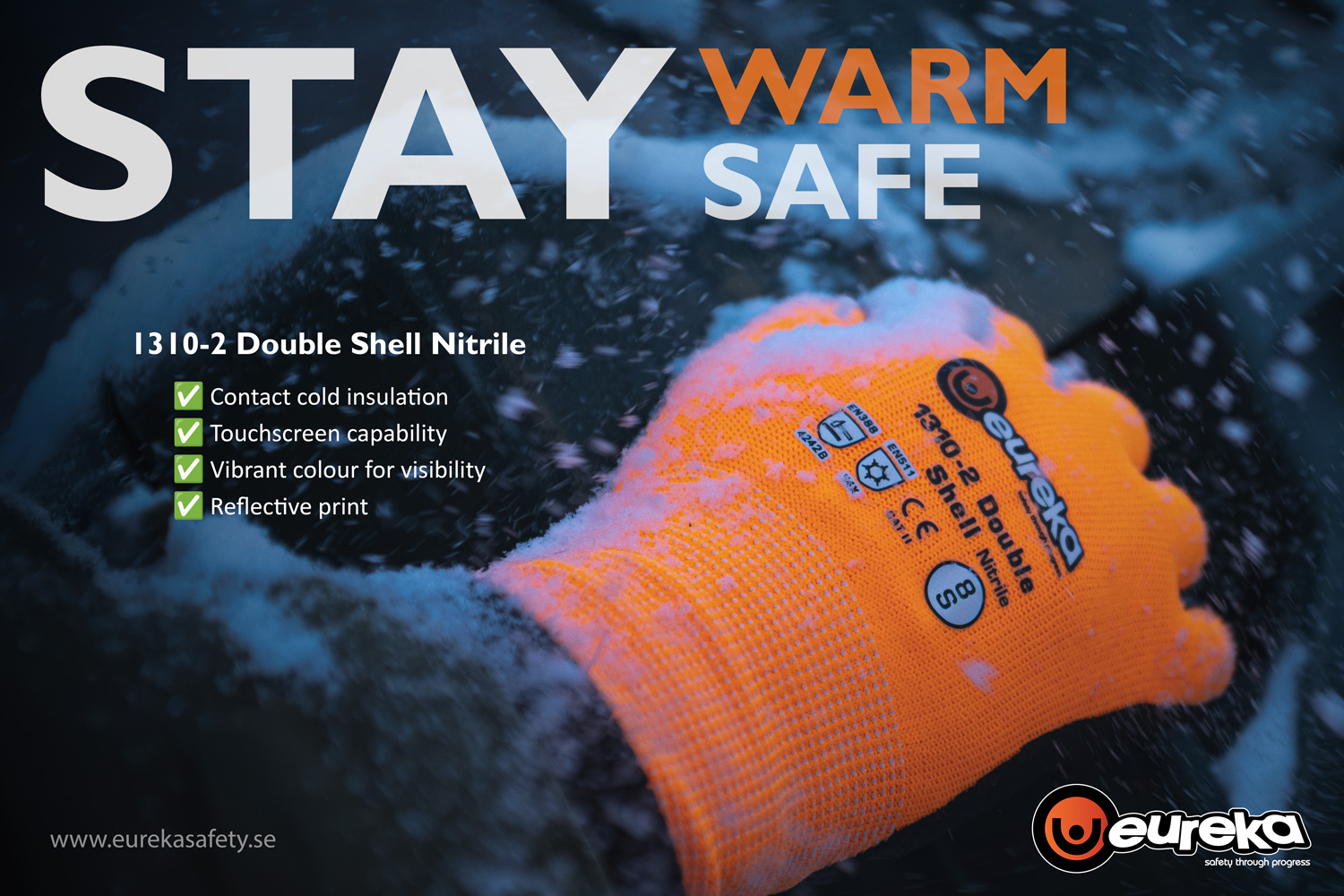 As winter arrives, ensure your hands are protected with our top-selling Eureka 1310-2DSN glove. Engineered for exceptional cold resistance, it achieves an EN511 contact cold insulation rating of Level 4, providing superior insulation in harsh conditions while maintaing high finger dexterity. Along with its EN388 Cut Level B protection, the 1310-2DSN is touchscreen compatible, allowing you to operate touchscreen devices without exposing your hands to the environment. Its vibrant orange colour and reflective print enhance visibility, improving safety in low-light environments.