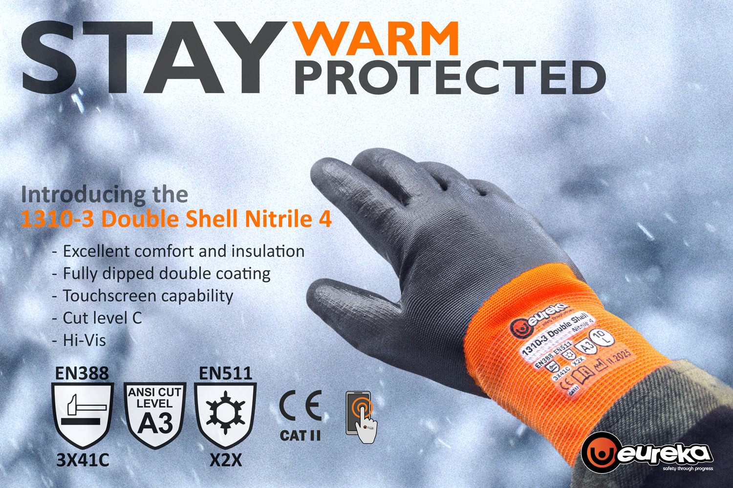 As spring approaches, the temperatures remain low and the night remains long. As the snow turns to sleet, keep your hands warm and dry with our new 1310-3 Double Shell Nitrile 4. Equipped with a soft acrylic terry inner-lining, double coating, hi-vis yarn, cut level C protection, and touchscreen capability, this glove is the perfect companion for cold, wet, and dark working environments.